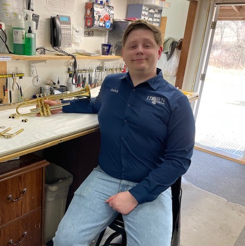 Josiah came to Horn Hospital, LLC as an apprentice in 2023. Josiah’s main focus is brass instrument repair; however, he also preps our lease instruments of all types. Josiah is responsible for our instrument accessories sales and inventory. He also assists with lease contract administration. When he’s not in the shop, Josiah can be found gaming, maintaining his collectibles or spending time with his cat Todd.
