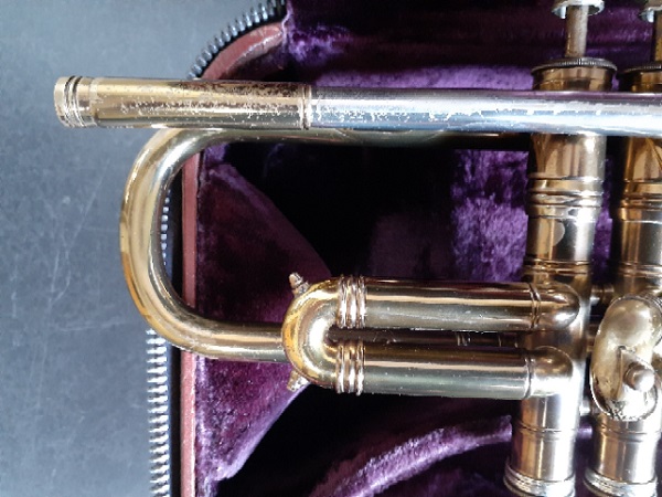 Selmer 24B Trumpet made circa 1955 in Paris, France. It has a one-piece bell and corrosion resistant solid nickel leadpipe and inner slide tubes. It comes in a vintage Selmer zippered hard case. This was a great horn in its day and can be great again to the right player. The lacquer is dark and worn in the usual places for an instrument that has been played frequently. The engraving on the bell is clear and sharp. Don’t let the wear and tear full you. This trumpet has plenty of life left in it!